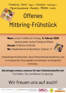 Beschreibung: Gemeinsam frühstücken, neue Menschen kennenlernen und in entspannter Atmosphäre miteinander ins Gespräch kommen. Alle bringen etwas Leckeres für das Frühstücksbuffet mit. Für Kaffee, Tee und Wasser ist gesorgt. Wir freuen uns auf euch!